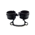 An exquisite pair of leather ankle cuffs. Fully adjustable buckle straps. Comes with a detachable double-trigger hook chain connecting to a D-Ring. All black with black Accessories